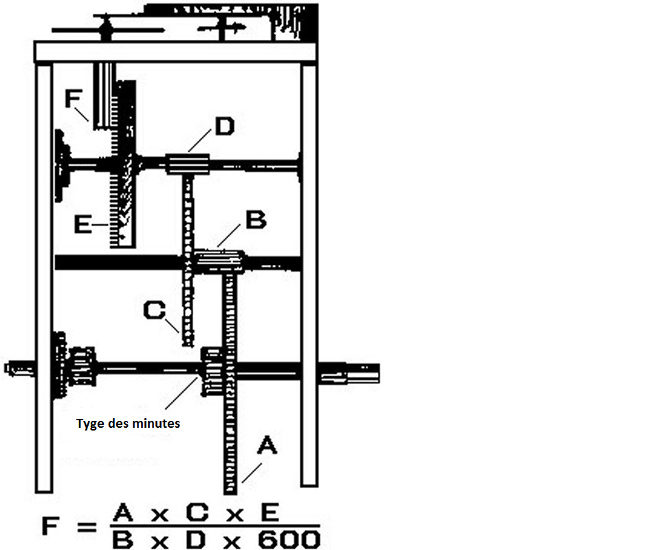 Pour calculer le nombre de feuilles que le pignon devrait avoir pour donner un ratio de 600 :1, veuillez-compter le nombre de dents sur les roues A, C et E. Comptez les dents sur les pignons B et D. Le nombre de dents sur la roue d'échappement est (A x C x E) / (B x D x 600)